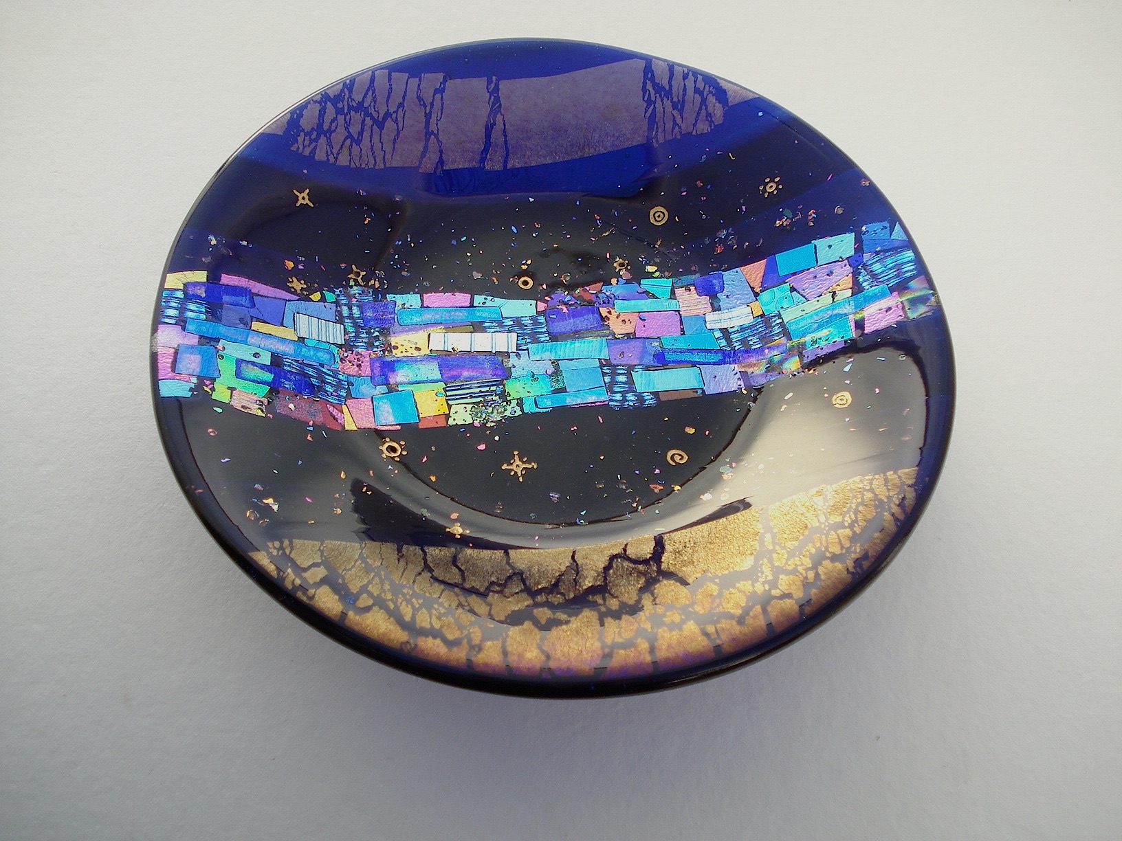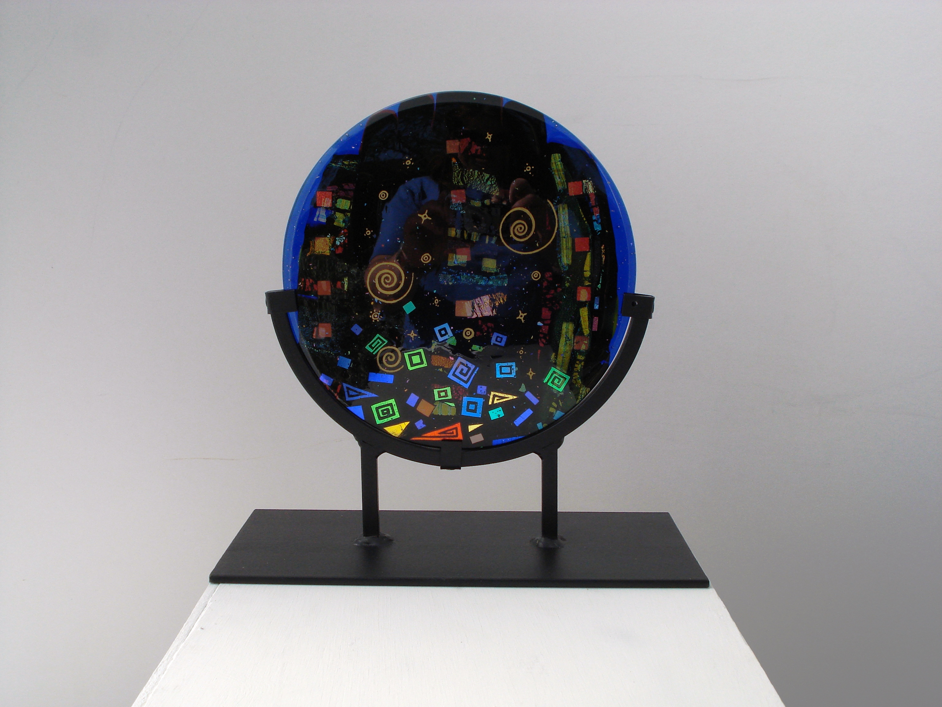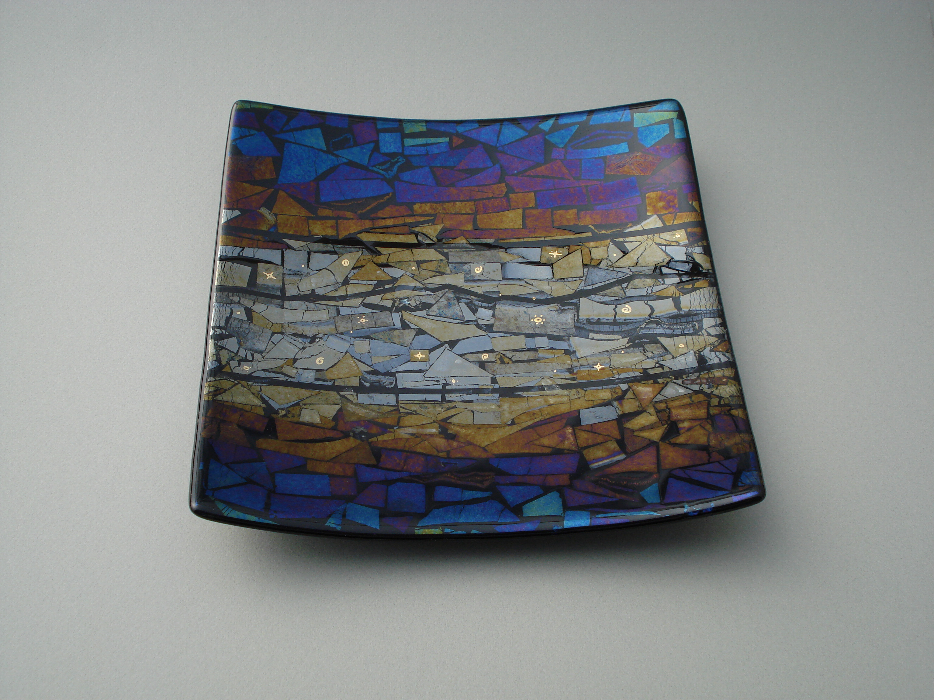 Fused glass is a process that involves the use of a kiln and dates back to the Ancient Egyptians. The technique could be compared to mosaic inlay work. Sometimes more than 50 pieces of glass, cut, ground and polished go into a single piece of artwork. Each piece may go through as many as five separate firings in a kiln. The first firing at high temperature fully fuses all of the design elements together. The second and subsequent firings are used to add more glass layers or fire polish the edges. |